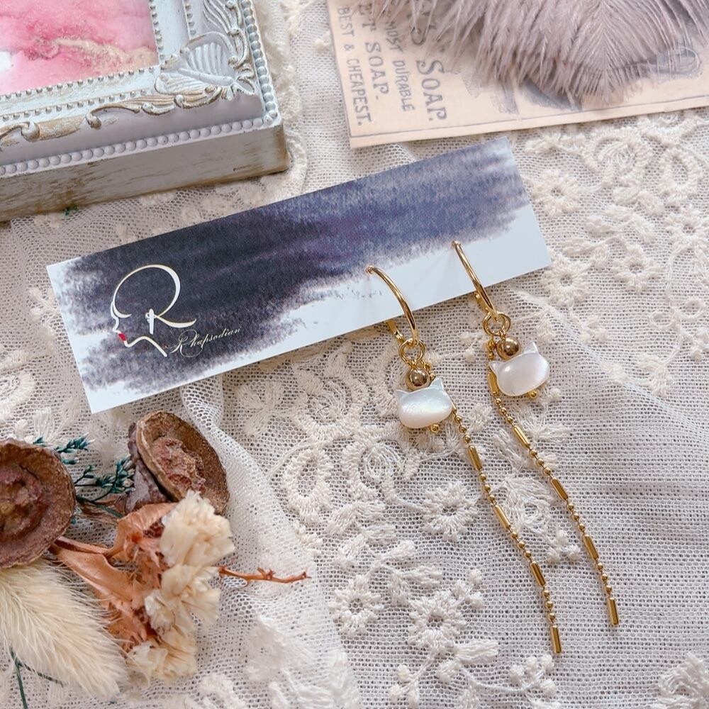 可愛らしい猫の形をしたシェルピアス。おしゃれで個性的なアクセサリー。