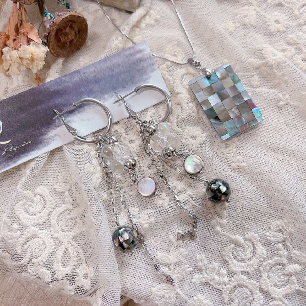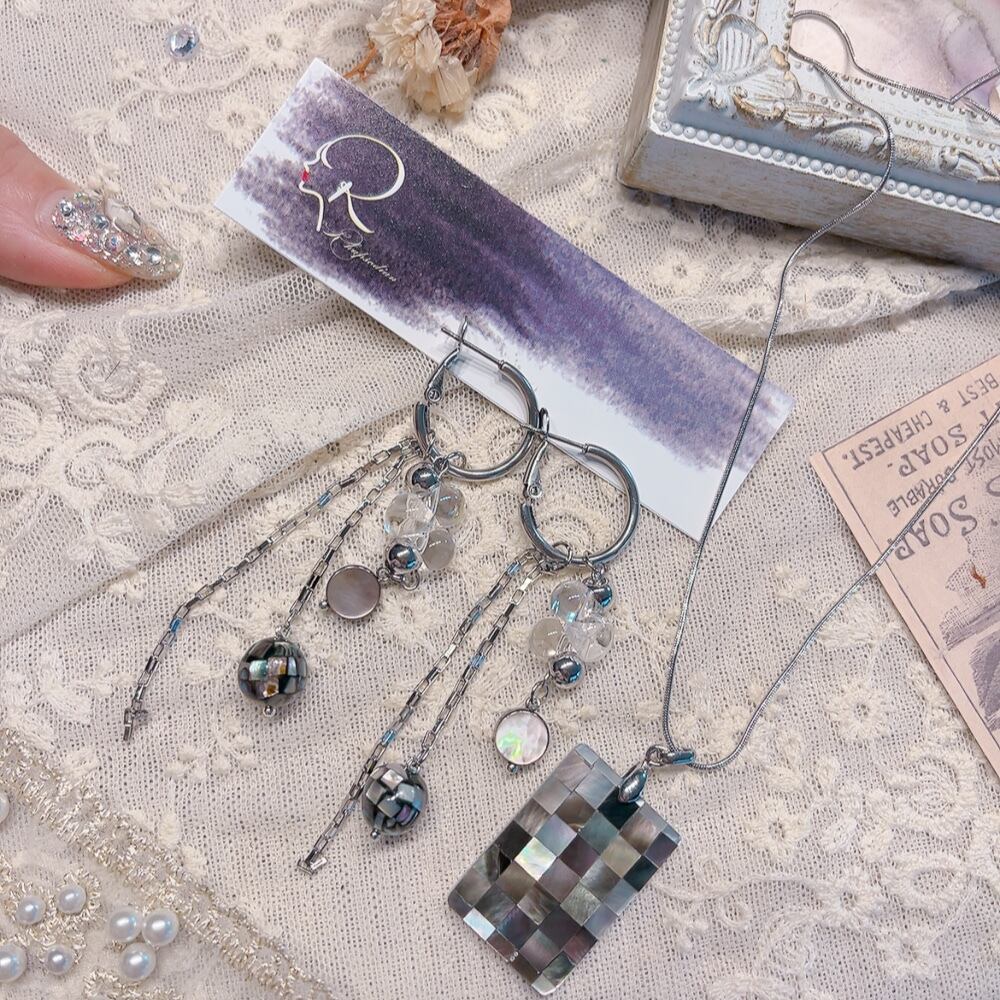 モザイクシェル ネックレス&ピアス セットは、エキゾチックな雰囲気漂うアクセサリーです。