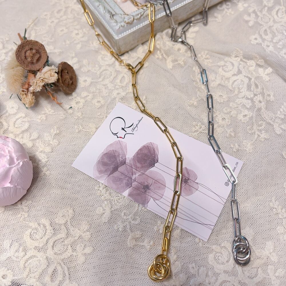 このネックレスは、一本のケーブルが繋がった独特なデザインが魅力的です。